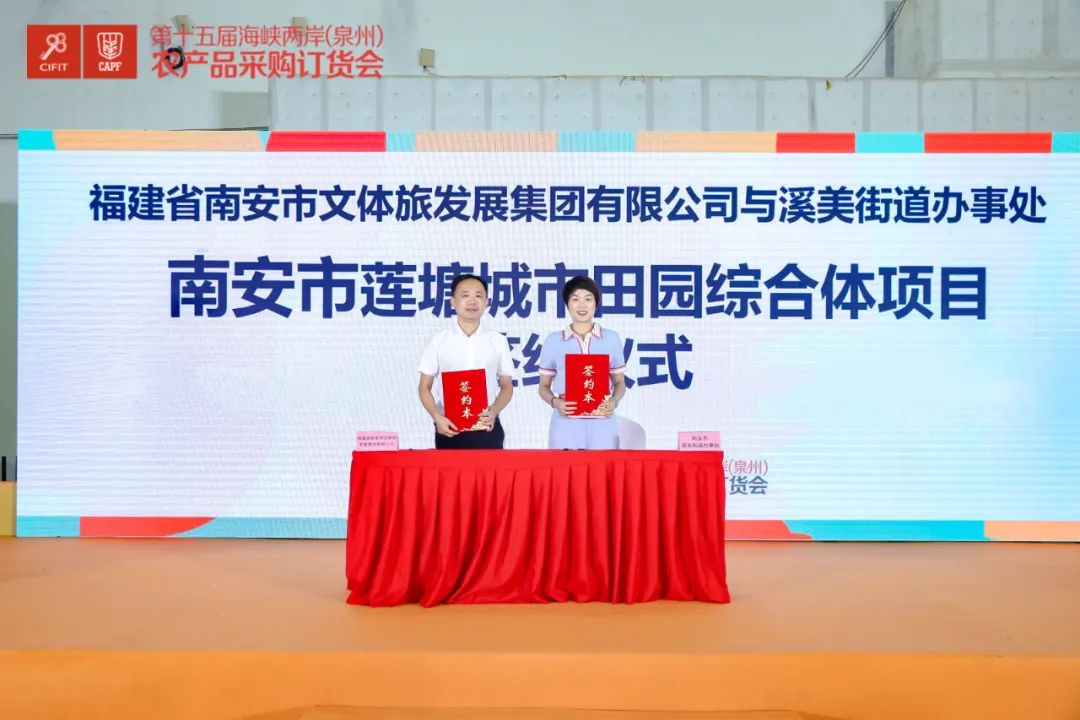 会上,还举行了集中签约仪式,现场共签约项目3个,总投资超4.5亿元,项目涉及信息采集系统、城市田园综合体、研学教育基地等多个产业领域。其中,南安泉新四季家庭农场与中国移动福建公司南安分公司诗山分局进行《数字果园》项目签约;福建省南安市文体旅发展集团有限公司与溪美街道办事处综合便民服务中心进行《南安市莲塘城市田园综合体》项目签约;福建省南安市文体旅发展集团有限公司与南安市梅山镇人民政府进行《南安市研学实践教育营地》项目签约。