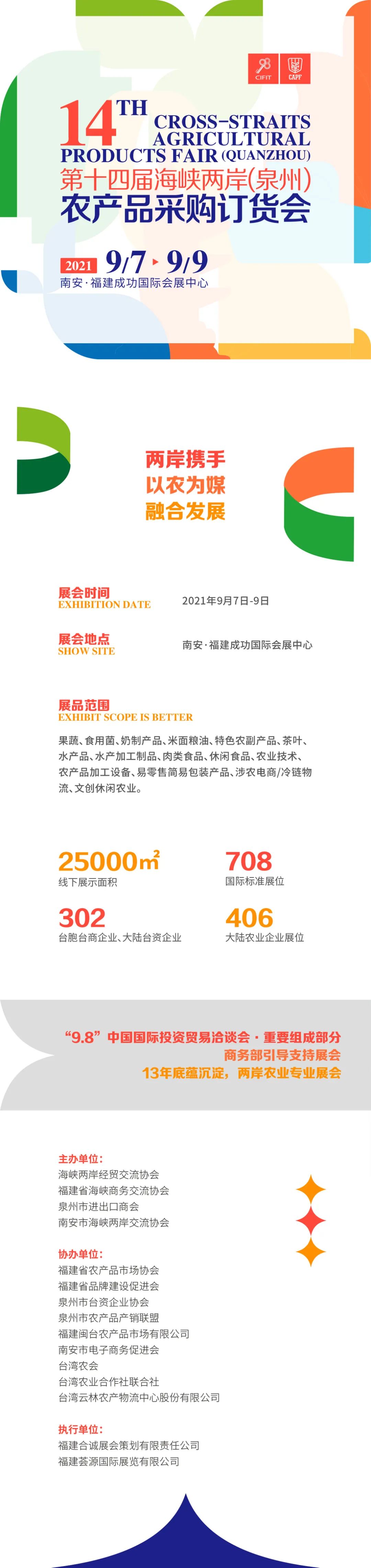 本届农订会由海峡两岸经贸交流协会、福建省海峡商务交流协会、泉州市进出口商会和南安市海峡两岸交流协会主办,由福建省农产品市场协会、福建省品牌建设促进会、泉州市台资企业协会、泉州市农产品产销联盟、福建闽台农产品市场有限公司、南安市电子商务促进会、台湾农会、台湾农业合作社联合社、台湾云林农产物流中心股份有限公司等单位协办,福建合诚展会策划有限责任公司、福建荟源国际展览有限公司执行。展会规模达25000平米,设置了13个展区、708个展位,共吸引来自全国各地的423家企业参与,台湾展商占比42.7%。